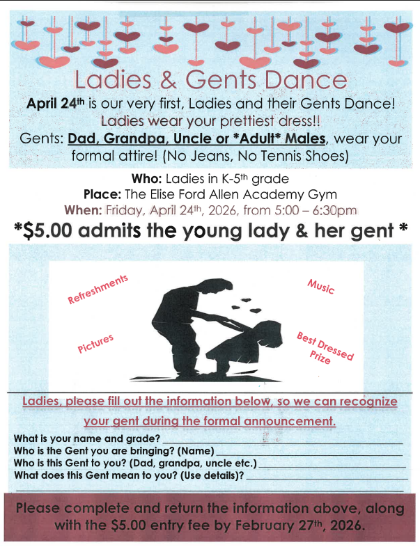 APR 24-Riverfront Museum: Gr.7/8 (9:30-11 am); Page Turners 2:45-3:45 pm; Ladies + Gents Dance ($5.00 per family-See flyer below) 5:00-6:30 pm; Center for Prevention of Abuse educating in K-8 classrooms- letters went home with details
