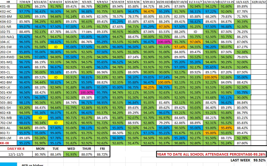 A PEEK AT OUR HOMEROOM ATTENDANCE! LOOK AT ALL THAT BLUE AND GREEN FOR LAST WEEK! OUR GOAL IS 95% EACH DAY! SHOUT OUT TO MS. WILSON'S 4TH GRADE CLASS WITH 100% FOR THE WEEK! |
