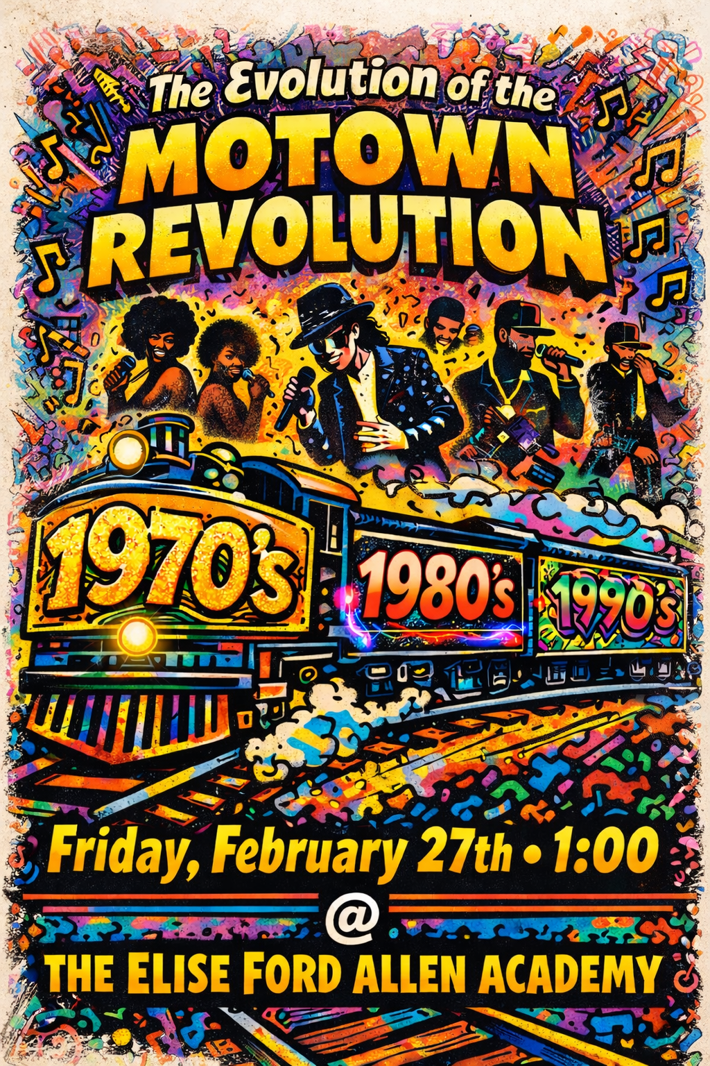 Join us for another year of engaging and high-energy Black History Month performances as our students bring history to life through music, movement, and storytelling. This year's special program celebrates the evolution of mainstream pop culture, picking up where we left off in the 1960's through the 1990s — showcasing how Funk, Disco, Hip-Hop, Rap and R&B propelled Black artists into the defining sound and fashion icons of popular culture as we close out the century!