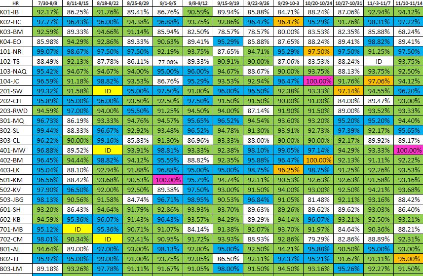 A PEEK AT OUR HOMEROOM ATTENDANCE! LOOK AT ALL THAT BLUE AND GREEN FOR LAST WEEK! OUR GOAL IS 95% EACH DAY! SHOUT OUT TO MS. WILSON'S 4TH GRADE CLASS WITH 100% FOR THE WEEK! |
