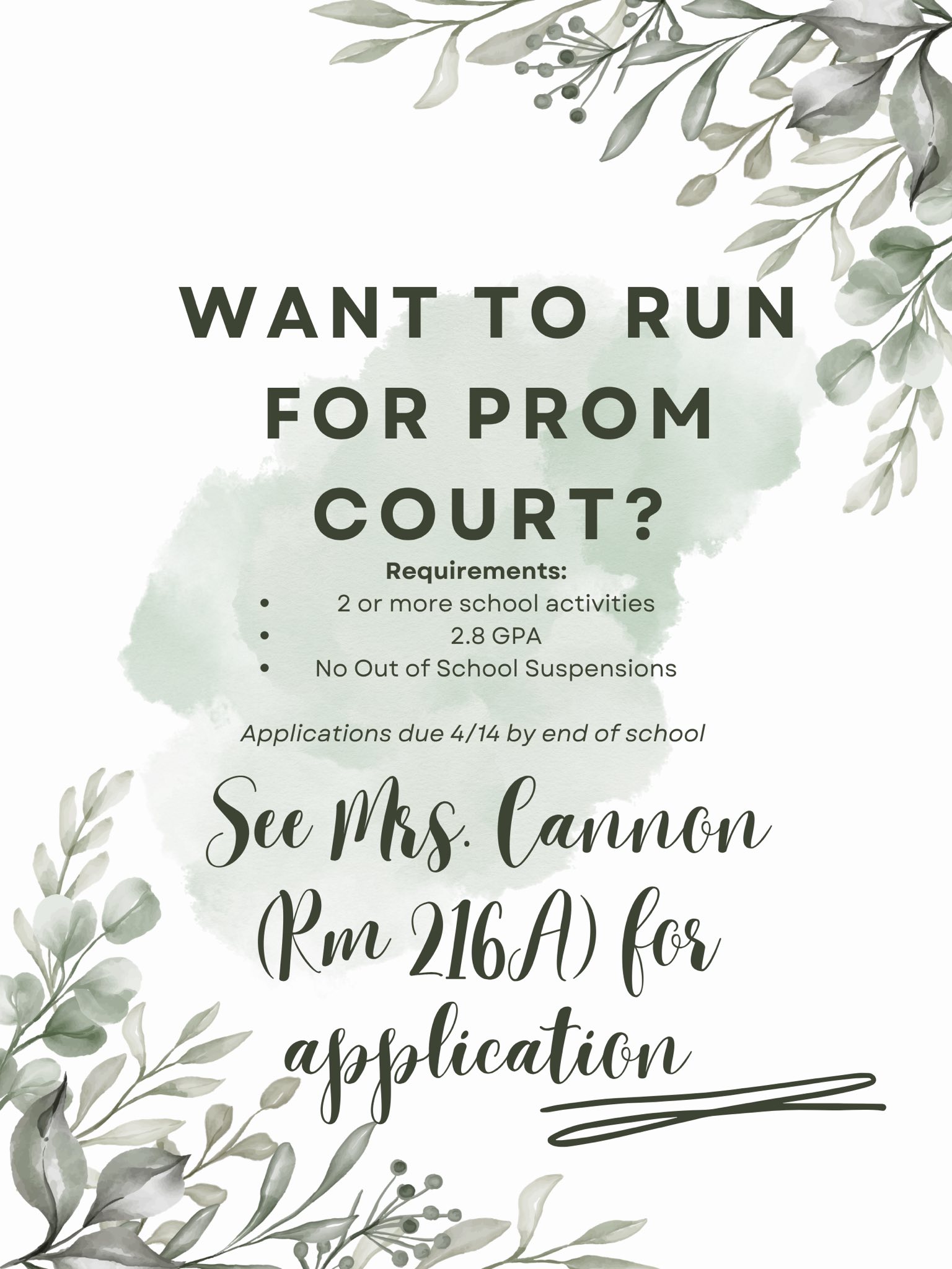 Students who want to run for Prom Court must turn in applications to Mrs. Cannon by April 14th.
