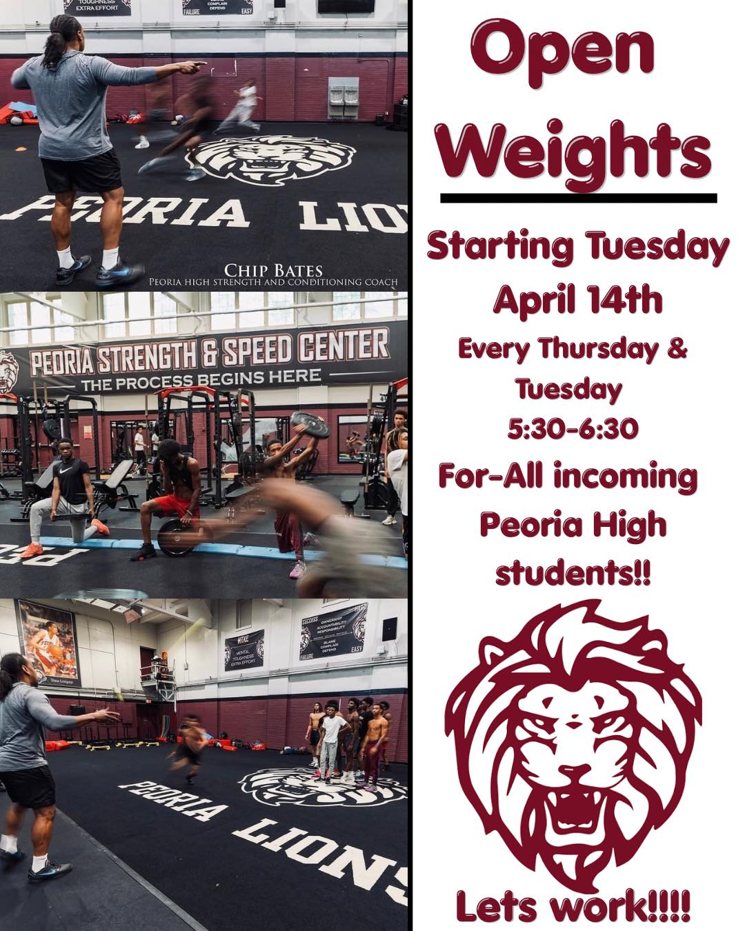 We are opening up more opportunities for our students to get better. Open Weights will begin Tuesday, April 14th and will run every Tuesday and Thursday from 5:30–6:30 PM. This is open to all incoming Peoria High students and is a great way to build strength, discipline, and consistency.