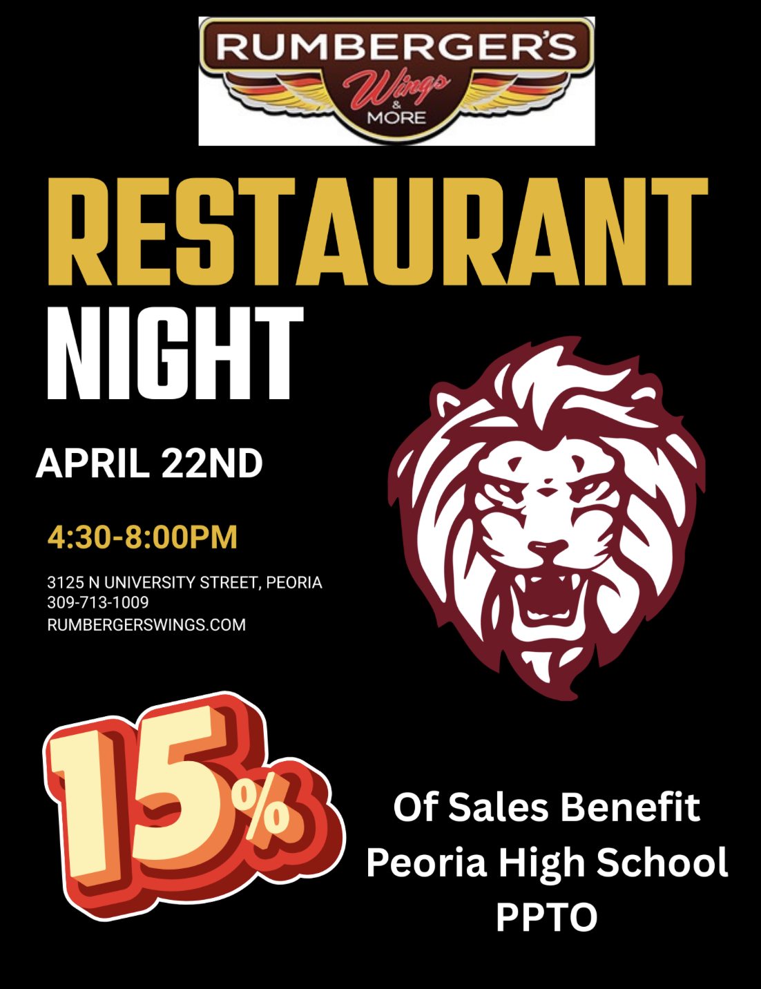 Support Peoria High on April 22nd from 4:30–8:00 PM at Rumberger’s Wings.
