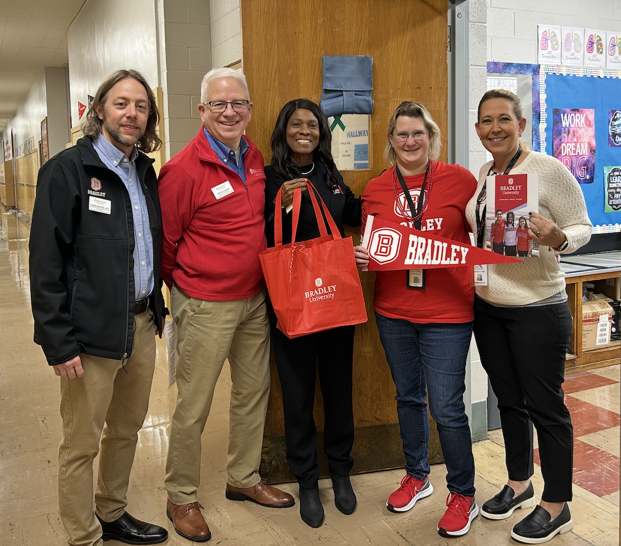 Over 50 staff members are Bradley Alumni. Jeff Wanko, Dean of the College of Education and Quinn Wherfel, Education Department Chair paid visits to several of them to wish them well in their careers and drop off Bradley swag to thank them for their recent participation in an alumni survey. |