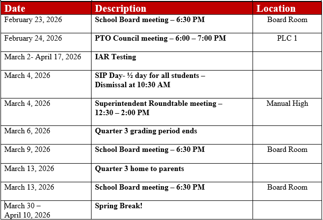• 6:30- School Board Meeting at Admin