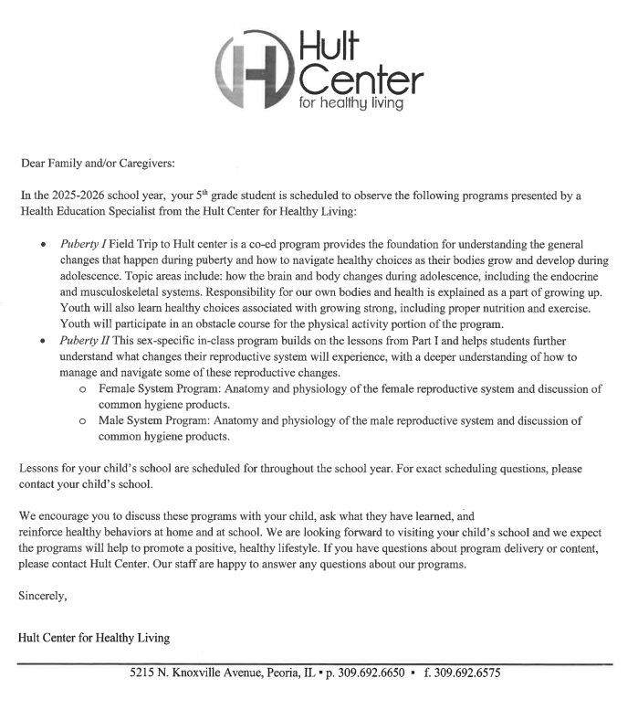 • 9:00-11:30 5th Grade TO HULT to learn about Puberty